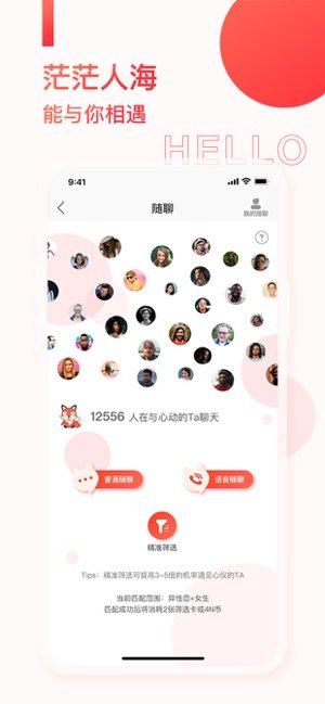 随时都能找到陪你聊天的朋友,通过筛选标签、性别,即刻开启畅聊不停的话痨模式。探寻身边还有哪些人与你有着共同爱好。系统会筛选出当前在线且可能让你感兴趣的用户,同时展示你和另一半的 CP 专属主页。