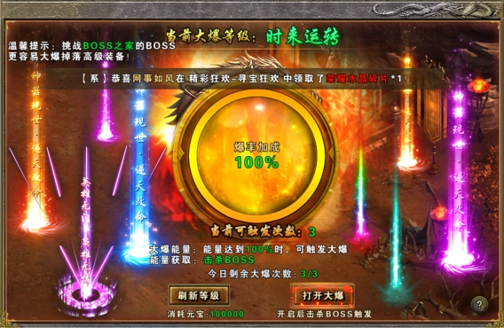 击杀小怪或BOSS都可增加大爆能量值可刷新大爆等级,等级越高,掉落极品装备概率越高大爆几率加成时来运转100%天随人愿200%鸿运当头300%神来气旺400%洪福齐天500%触发大爆后大爆等级重新刷新有大爆次数上限,每天24时重置次数提升特权,VIP可增加大爆次数温馨提示:挑战BOSS之家的BOSS更容易大爆掉落高级装备!