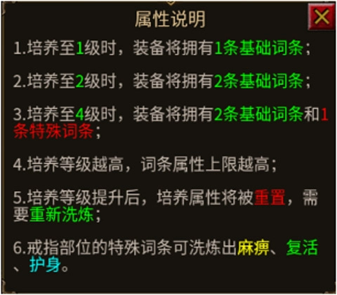 拥有:常规装备属性战力(固定)+词条洗练属性战力(浮动),培养等级越高,词条可洗练属性越高,属于进阶装备。