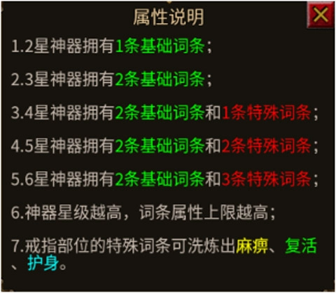 属于最高级装备,玩家通过开(获取途径:找玩家收或者爆——野外世界行会亡魂福利BOSS、野外小怪、活动)神器宝箱(开一次100金元,获得50神器碎片和随机价值6-50RMB的材料),获得神器碎片。在神器兑换界面,消耗神器碎片兑换神器。兑换的神器为神1等级,需要二合一的方式,逐级合成,最高合到神6等级。神器要么不玩,要么至少玩神5。因为神5就有2个基础词条和2个特殊词条,对比同等级其他装备优势就开始明显。(现版本大幅加强了神器,可以引导土豪做神器。神豪可以引导做全身神6)