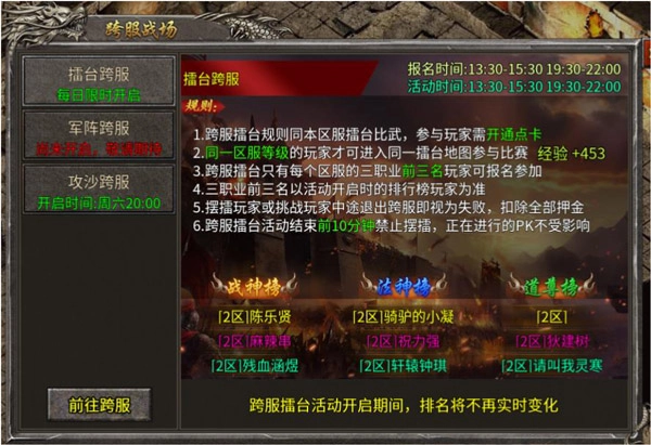 跨服系统目前共有3个跨服活动,分别是军阵跨服、神将跨服、攻沙跨服。从开区第二周的周6开始启动,之后每周6都有一个跨服,循环顺序为军阵跨服——神将跨服——攻沙跨服。跨服系统是以行会为单位,所以组建行会很重要,不仅要有高战,还要有足够多的人。跨服开启后,需要会长先报名,之后玩家才能报名。会长可以决定谁不能参加。另外跨服的奖励中以神将跨服最高,其次是军阵,再是攻沙。
