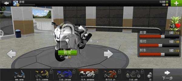 4.虚拟货币:游戏中有一个虚拟货币系统,玩家可以通过完成比赛、特技表演和观看广告来获得虚拟货币,用于购买新的摩托车和道具进行操作和选择。