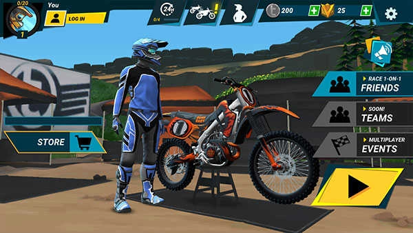 1、打开疯狂特技摩托车3最新版本,进入大厅页面,左侧的“store”是商店,上方分别是摩托车型号和车手,左上角是个人中心,进入可以查看详情和战绩。