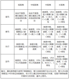 这张属性表标注了育成成功所需的属性值条件,我们需依据这些条件对马娘开展针对性训练。从属性角度而言,在开服环境里,逃马(仅考虑纯属性流,暂不涉及技能流)的表现略显优异。