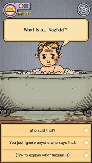 玩家需保持耐心,第一步,阻止孩子前往学校;接着,通过写信的方式与孩子的父亲交流,寻求帮助。在孩子暂不上学的这段时间,逐步引导他吃饭、洗澡,使其状态恢复。最后,带着孩子搬离此地,逃离这个充斥着恶意的小镇与学校,至此游戏便进入结局。