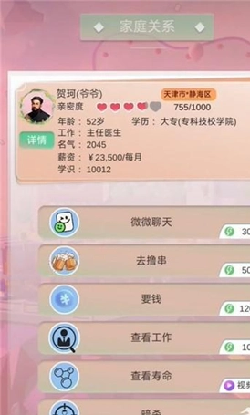 家族成员(如爷爷奶奶)可进行聊天、赠礼、要钱等互动;