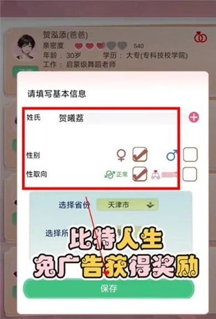 开局设定包括姓名、性别、取向、省份、地区等选项;