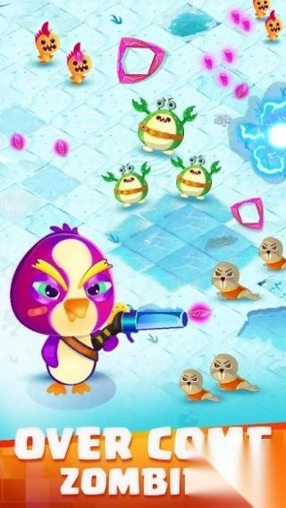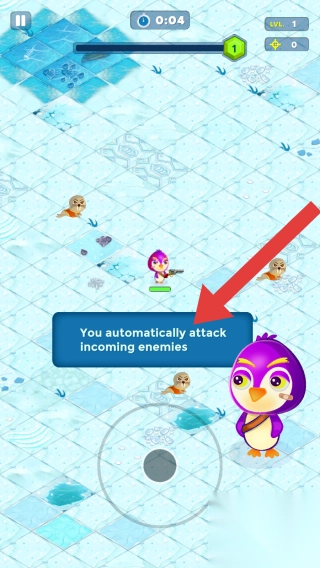 2、显示玩家操控角色在冰雪场景战斗,提示文字“你会自动攻击来袭敌人”,界面有时间、等级等信息,还有可爱的角色与敌人形象。