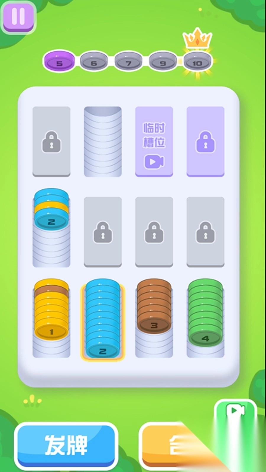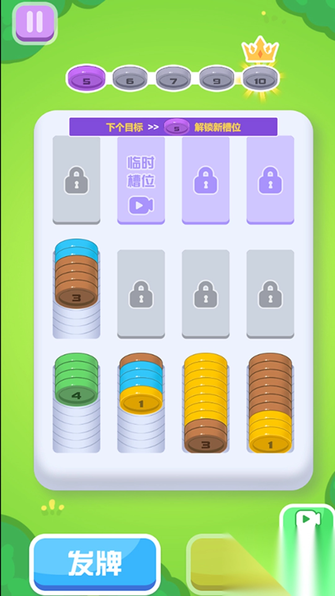 2、当相同颜色和数字的硬币堆叠满时,会自动合成数字更高的硬币,以此清理空间并推进游戏进度。
