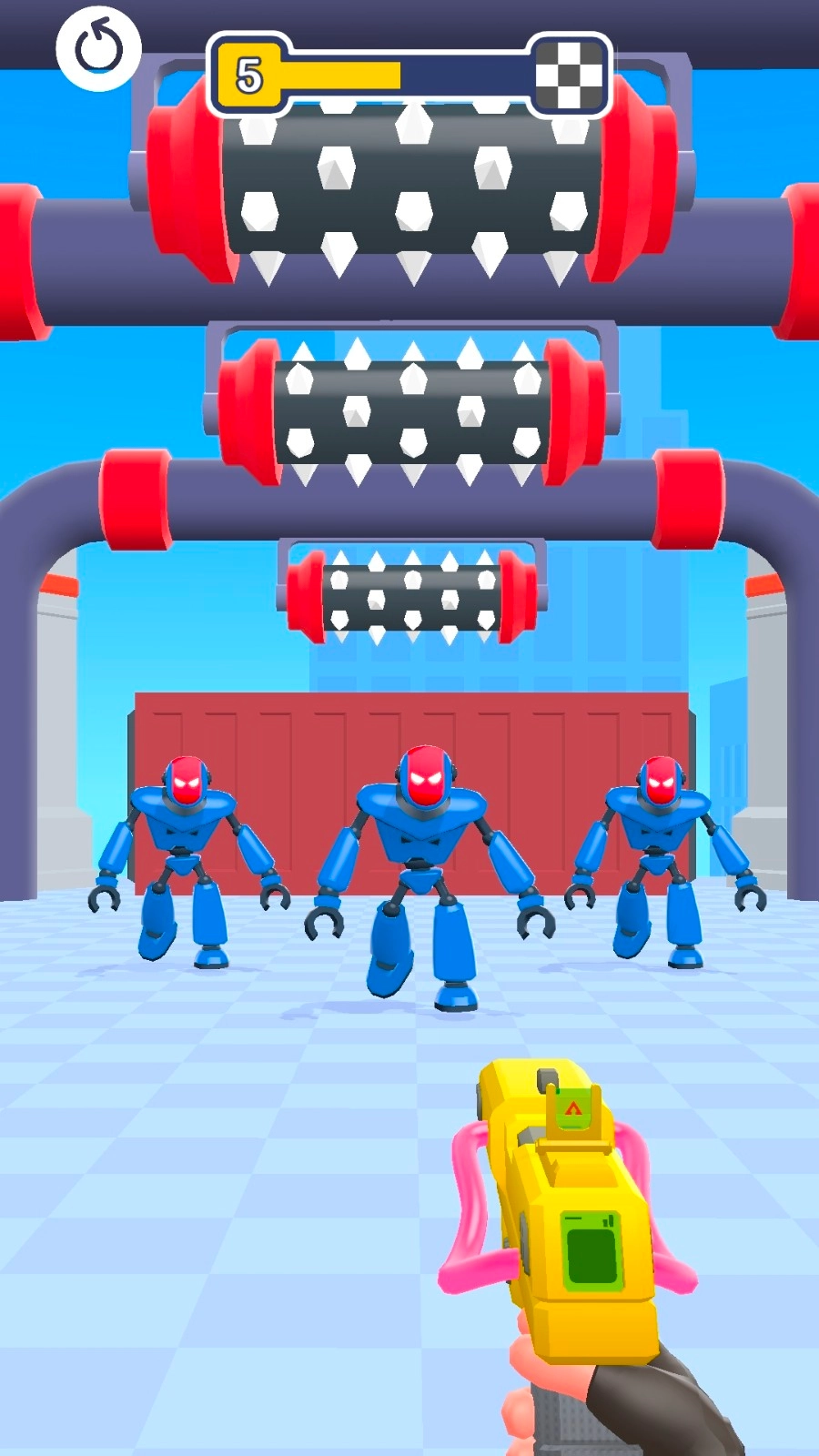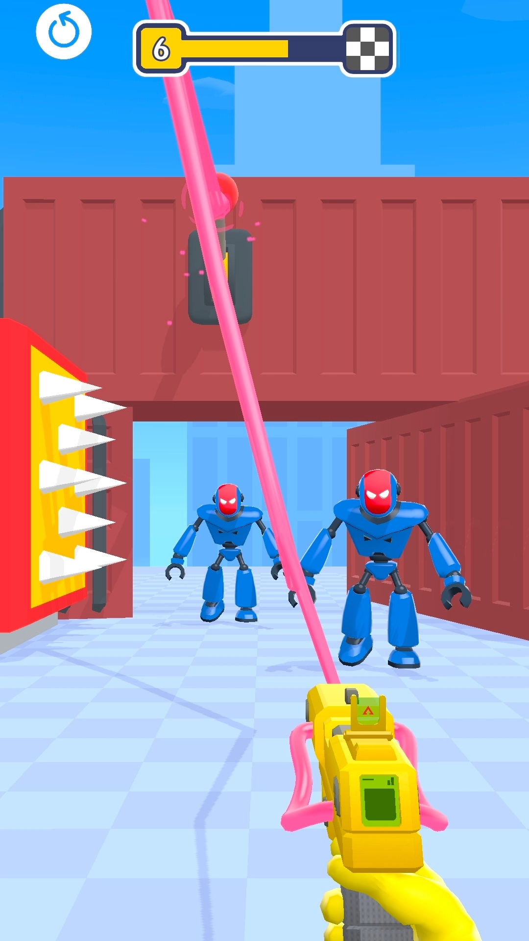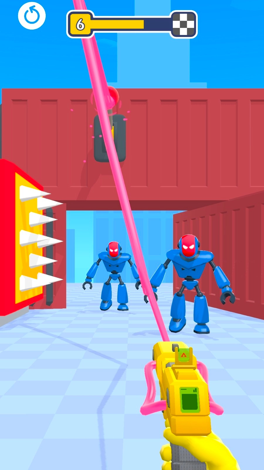 1、留意场景里的各种元素,优先把机器人和高伤害机关(比如带刺滚筒这类)连接起来,这样机器人靠近的时候就能触发机关,实现快速清理敌人的效果。