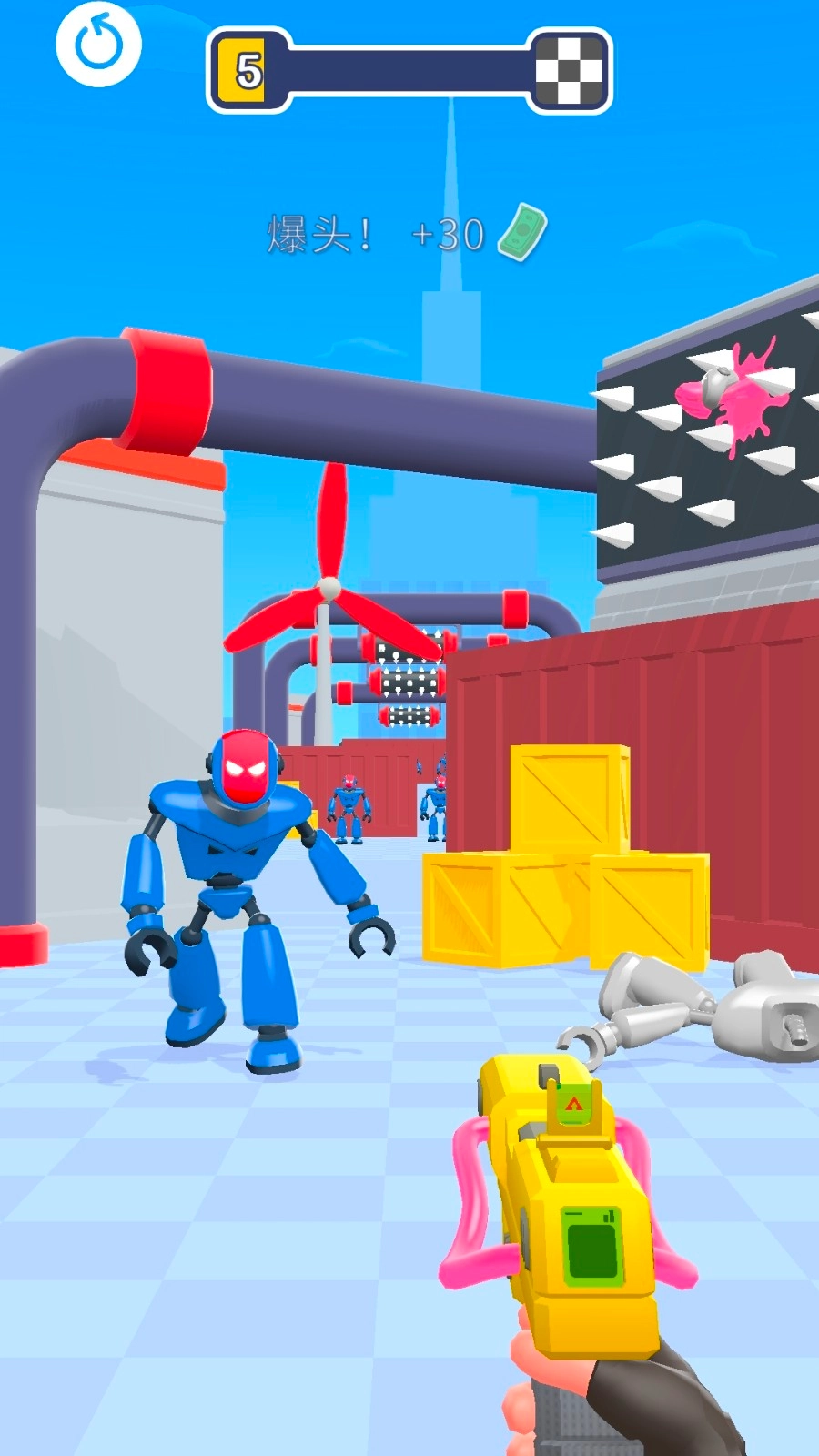 3、找准机器人的弱点部位进行连接,像头部这类位置,就能触发爆头效果,进而额外获得奖励。