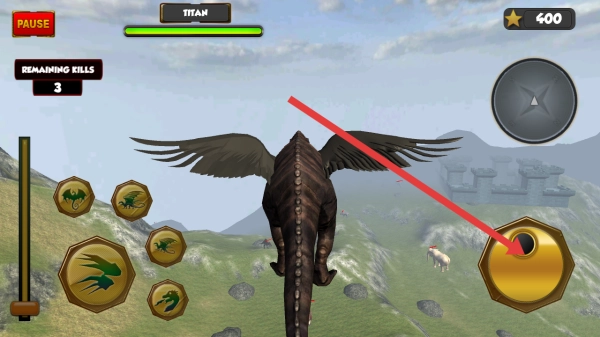 2、操控翅膀恐龙在空中飞行,从上往下锁定草原上的其他恐龙等目标,发现目标降落进行攻击。