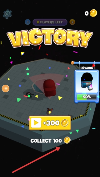3、在击败所有对手之后,点击胜利界面上的COLLECT100按钮领取金币,通过积累奖励来解锁更多内容,随后开启新的竞技对局。