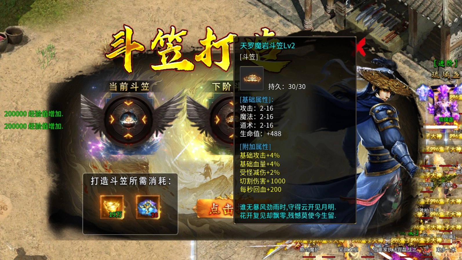 2、斗笠打造:消耗元宝和斗笠碎片即可打造,每提升一级都会给与非常丰富的属性加成,斗笠碎片可以通过打怪获得。