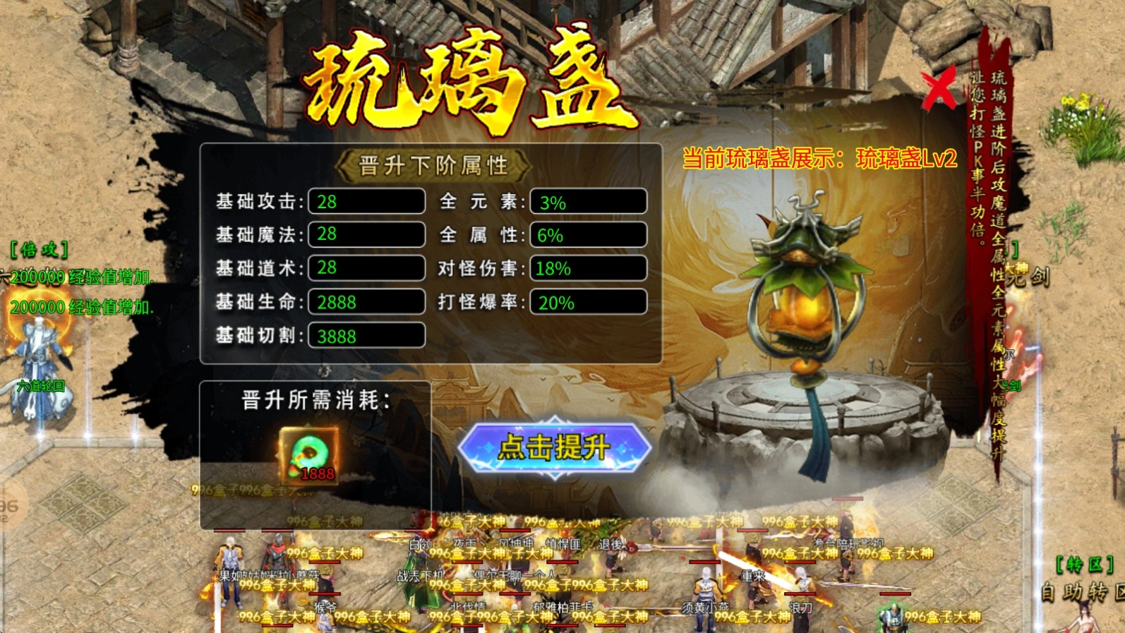 4、琉璃盏:消耗仙晶就能进行提升,能带来十分全面的属性加成,同时还可提高打怪的爆率。