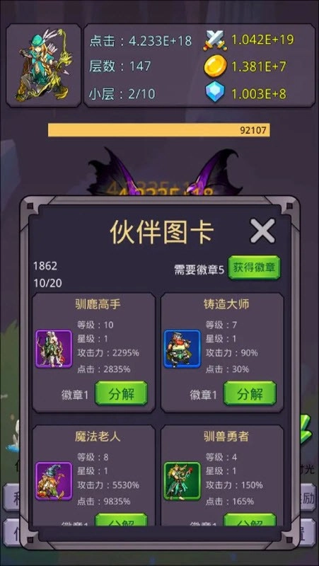 游戏内的帮助界面包含伙伴、宠物、神器等内容,让玩家能借助这些功能持续提升自身能力。就像伙伴可通过金币招募,升级后能大幅提高主角的攻击力,是战斗中的得力帮手。