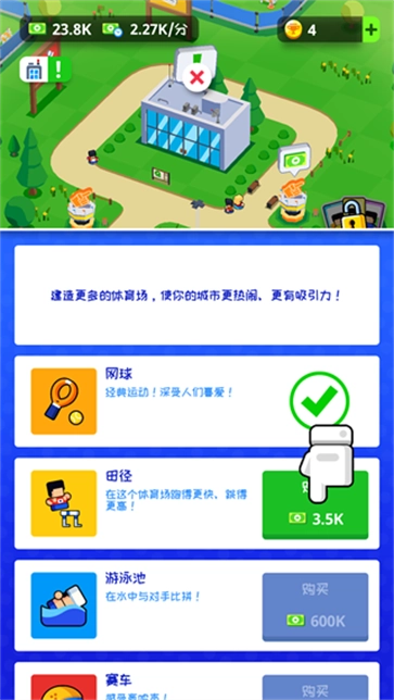 4、建立自己的体育城市,投资您赚到的钱,购买新建筑,向您的城市添加各种体育运动。