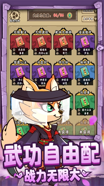 独具创新的秘籍修炼玩法:64本武功绝学,5种品质,14大门派,10大职业;任意组合门派,职业,可搭配出不同的武学秘技。