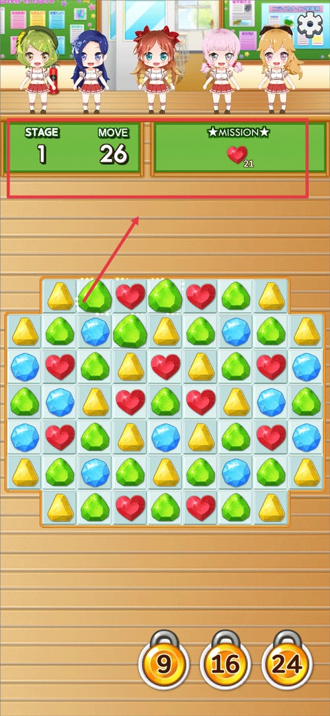 2、进入后游戏后,上方move为游戏移动步数,mission为游戏过关目标