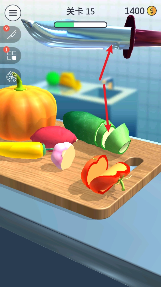 2、在关卡里,我们只要点击屏幕,就能让刀落下,切割眼前的物品。