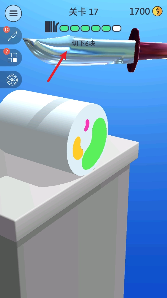 4、每一个关卡都设有不同的目标,达成目标就能通关,比如在这个关卡里,就需要把物品切成5块。