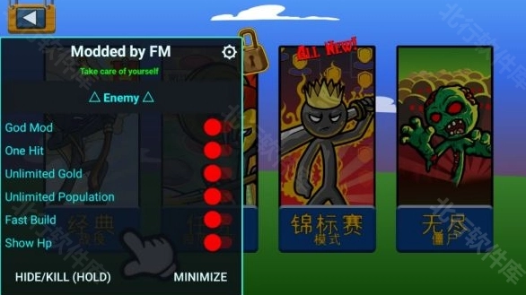 4、玩家既能体验原版游戏带来的超爽对战快感,还可借助魔改菜单调整游戏数据,让对手与火柴人获得史诗级强化,化身为“上帝”般的存在,尽情感受火柴人战争的丰富趣味!