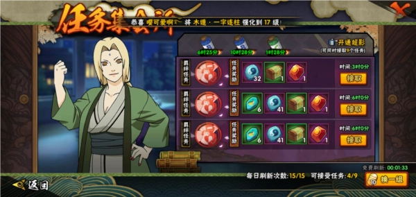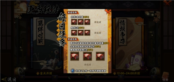 3、日常任务更轻松,基础日常十分钟即可完成,每周总活跃度达到500,将赠送密卷等火影忍者相关材料