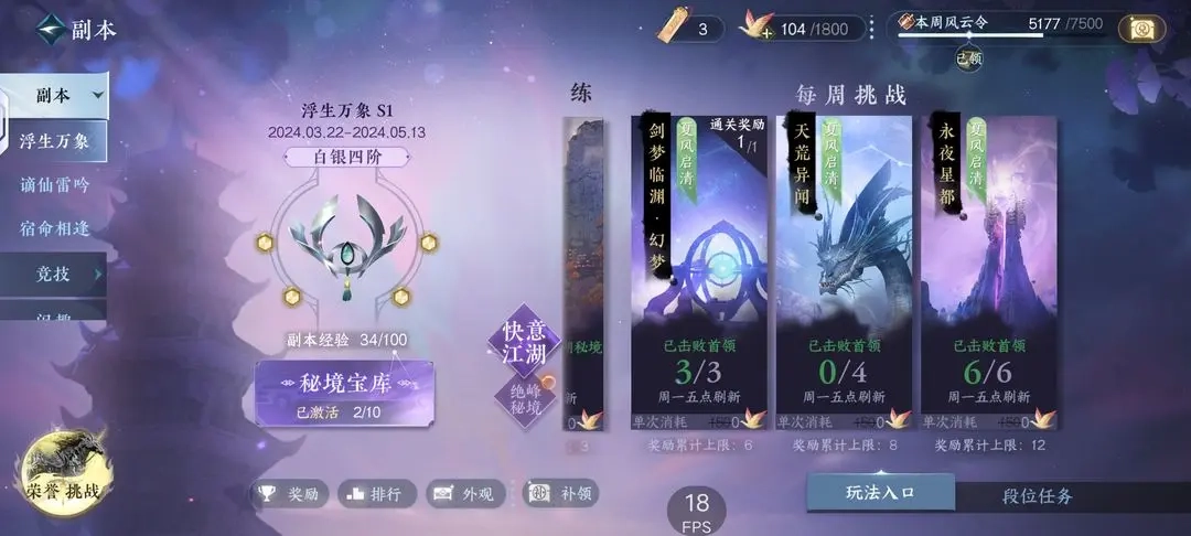 这个时候我们的装备评分大概在八九万,我们就可以去打副本,先打浮生万象千万别碰其他两个。(所有副本都可以用人机打过)(先打天荒异闻,剑梦,最后打永夜)(商城每周买五个吉运签,后三关都用一遍,剩下的补没出的装备)