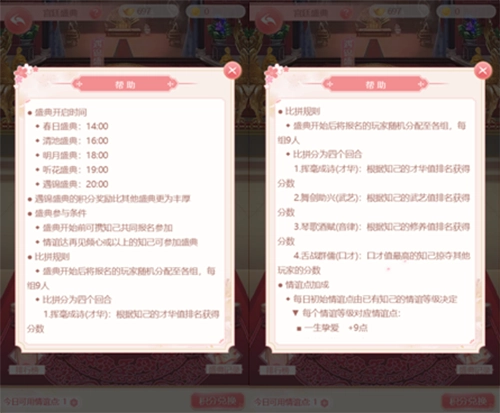 提升知己的情谊,可以提高小主的势力,同时也可以解锁乾清宫,参与宫廷盛典。每提升一位知己达到再见倾心,则可以多参加一场盛典,最高5场盛典,每场盛典开启时间都不同,小主可在盛典开始前,派遣知己参与,参与前可以分配情谊点,临时增加知己的属性。每场盛典比拼分为4个回合,分别比拼才华、武艺、音律、口才四项属性,其中才华、武艺、音律回合可获得分数,口才回合可以掠夺其他玩家分数!以最终分数作为排名依据,根据排名发放奖励。