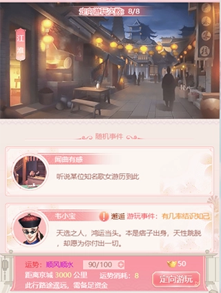 小主可以通过点击游戏界面右下方【随机游玩】的方式,随机到达某个地点,可以与不同地点的随机人物偶遇,更有机会获得丰厚奖励及道具哦!每次随机游玩消耗1点体力,体力每30分钟恢复1点。