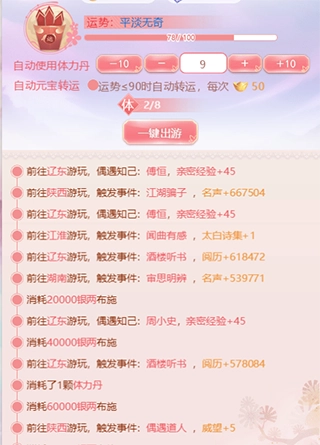 运势越高,遇到知己的几率就越大。要是想更快地结识知己,不妨点击左下角的【运势签】来提升当前运势。布施时,用银两能增加2点运势,用元宝转运则可直接+10点运势~ 另外,布施页面还能设置【自动布施】,勾选后每次游玩结束,系统会自动把运势补到你设定的数值。需要注意的是,运势每15分钟会恢复1点,但最多只能恢复到90点哦。