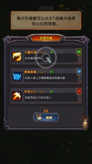 每次升级时,你可以从三个候选技能里挑选一个。不妨试试各种技能搭配,借助最优的技能组合策略来存活下去。