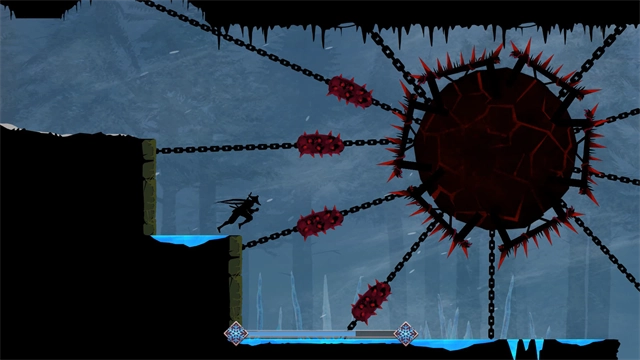 3、这是许多新手都会感到犯难的区域,我暂且称它为“钟摆锤”。不少刚接触的玩家都不清楚该怎么通过这里,其实方法并不复杂,只要把握好时机、掌握一点小技巧就能做到。首先要等锤子从朝向你的方向往远离你的方向摆动,然后起跳(需要注意:这个摇摆锤不只有上方的大球,底部还有个小球,跳跃时千万不能碰到);等大球往回摆动时,就跟着小球的节奏前进,当大球摆到边缘位置会有短暂停顿,这时一个小跳(用二段跳的话会更稳妥)就能顺利通过了。