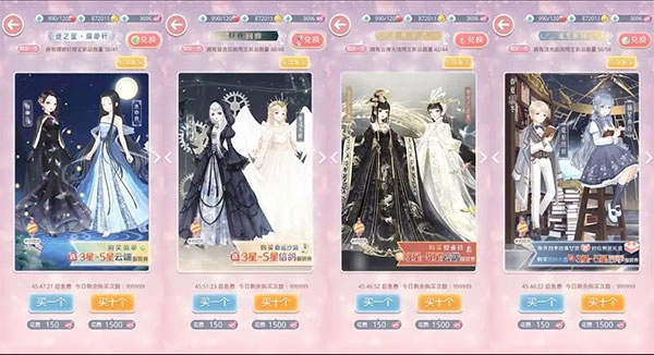 流光庭园、云禅天塔、昼夜回廊和缥缈轩这四个抽奖阁中,单个奖券的购买价格为150钻石,可以一次性购买十张券,使用抽奖券抽奖后,必得当前抽奖阁的兑换道具和3-5星限定服饰。