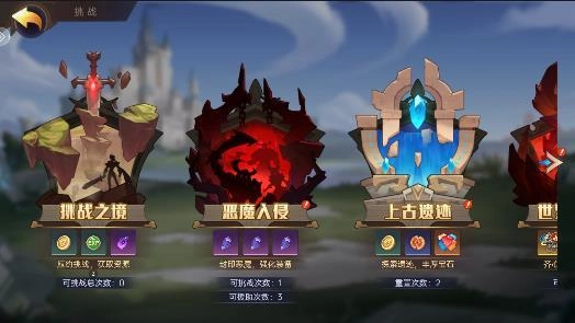 游戏挑战副本主要包含下图里的五个,其中挑战之境用于获取日常养成资源,会随玩家等级开放;恶魔入侵则是三人组队刷怪,可获取基础强化资源。这两个副本都比较简单,大家尝试后就能掌握,若想在恶魔入侵中多刷怪,建议多使用AOE能力较强的英雄。