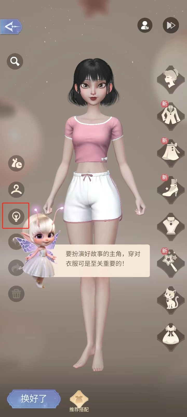 9、要想扮演好故事的主角,穿对衣服可是至关重要的;点击左方的灯泡图标;