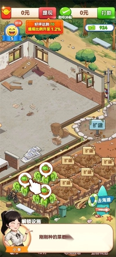 向往的退休生活红包版正版,你将回到农村开启创业之旅,每日种植作物并可直接上架售卖,整个流程十分详尽。只要订单完成,就能获得不少红包,完全无需担心。此外还能及时升级桌椅,只需完成相应任务即可。向往退休生活这款应用值得你去体验一番。