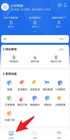 2、成功登录后,会进入首页,此时点击底部导航栏的“工作台”选项,即可进入功能操作页面。
