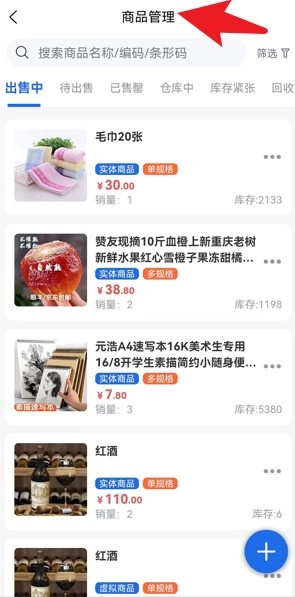 4、点开“商品管理”模块,就能查看全部商品的销售状况,还能执行上架、编辑、调整库存等操作。