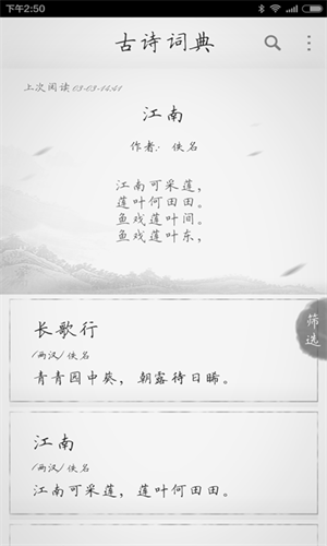 《古诗大全300首(幼儿园版)》是一款实用的在线古诗学习软件,它能让每一位幼儿用户一站式学习全网极为全面的古诗词,在这里,用户可轻松学到更多诗词。该软件界面清爽,幼儿用户能在其中一站式学习,还可在筛选功能中搜索想要学习的古诗,能依据作者、朝代、类型进行筛选,助力幼儿从简单内容开启学习之旅。