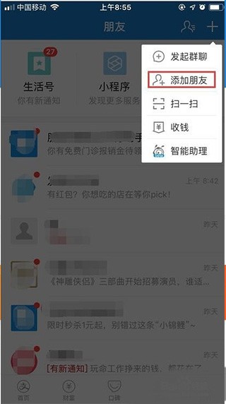 3、在工具栏中找到“添加朋友”字样并点击,进入添加朋友页面。在此页面中,会出现多种添加好友的方式。