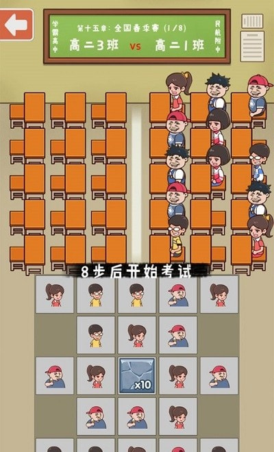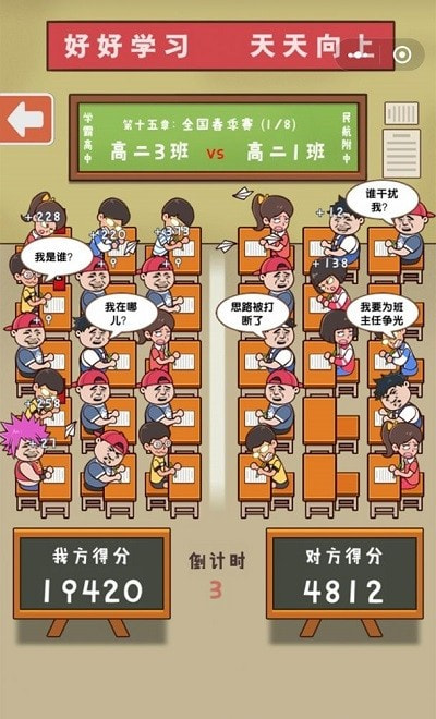 4. 题材充满怀旧感。采用经典考试题材,两个班级展开考试成绩的激烈比拼。而我们的任务,便是助力这个班级的学生奋力考上理想大学。1、这款游戏简直太好玩啦,操作简单,趣味性十足呢!