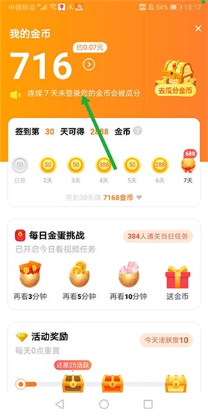 成功登录之后,于个人中心的页面里,点击金币所在的区域。
