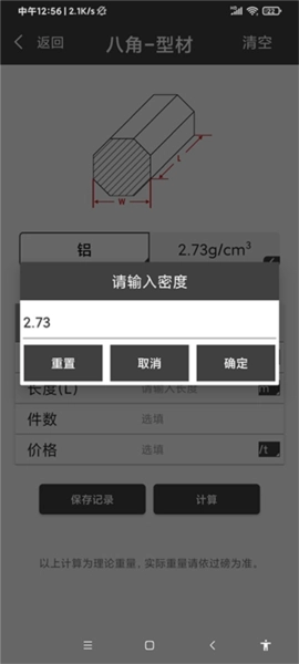 材料重量计算器是安阳正则网络科技有限公司研发的一款用于计算各种金属重量的应用软件。它不仅能支持计算管、方、T、C、圆等多种不同型材的金属重量、价格与长度,就连带有弧度的型材也能计算,用户仅需输入宽度或其他相关数据就行。而且,该工具还支持钢铁、铝合金、铸铁、镍、铜等数十种不同金属,同时支持自定义密度和金属类型。有了这款软件,大家在日常生活中也能轻松完成测量,为你带来更高的工作效率,节省计算成本。