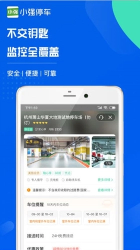 5、进入停车场的详情页面可以查看停车场的照片、名称、评价、评分、接送时间和温馨提示等内容;