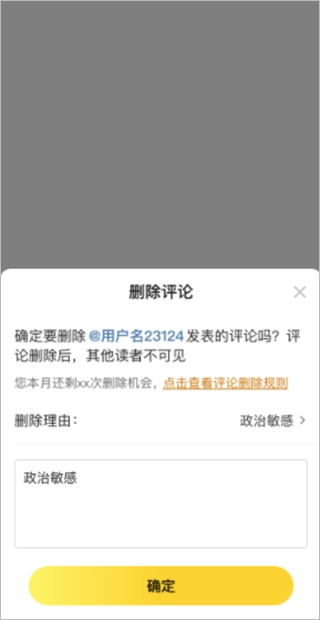 大家点击后将弹出确认操作弹窗,选择删除的理由或填写合理的原因,无需审核即可删除成功。