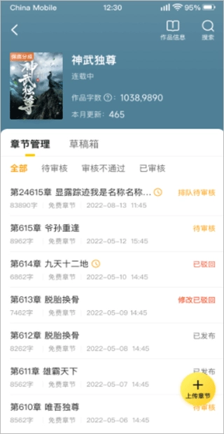 作品创作:支持创建作品,便捷发布、修改章节、保存草稿
