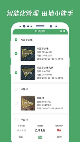 2、地块模块:此模块为存储测量的土地信息,用户可以浏览和计算价格。