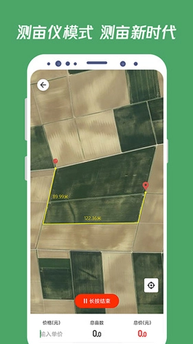 主要两个工能,画地模式和绕地模式,画地模式可以手动打点地图形成圈来测亩并且可以自动计算价格。绕地模式为人工开启后,围绕需要测量的土地行走,GPS会自动定位,最后可自动测量土地面积。