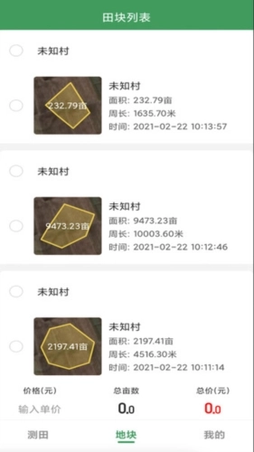 5、一键可以选择多个地块,自动统计并展示总亩数,也可以查看总价;